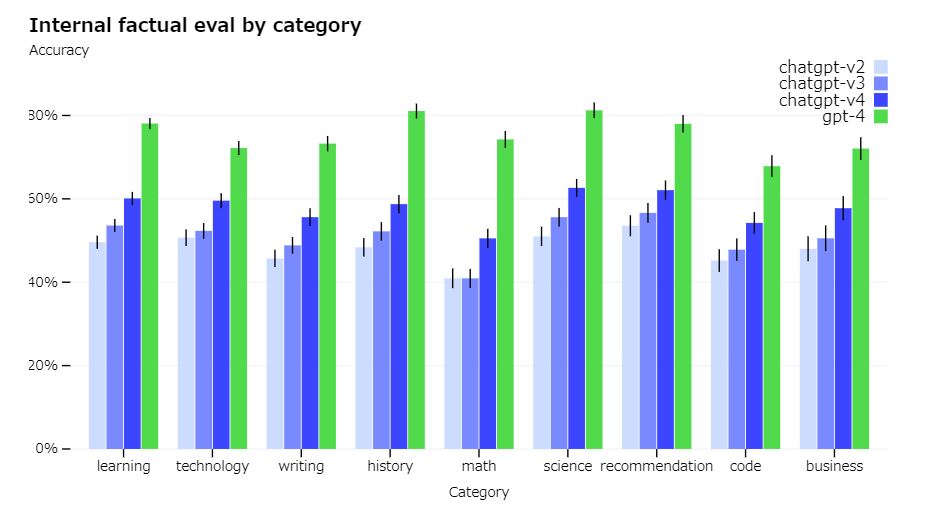 환각에 관해서「학습」이나「기술」을 포함한 9개의 카테고리에 있어서, ChatGPTV2 ~ V4와 GPT-4가 생성하는 응답의 팩트 체크를 OpenAI에서 실시한 결과, GPT-4가 가장 사실과 합치하는 응답을 생성한다는 것이 밝혀졌습니다.