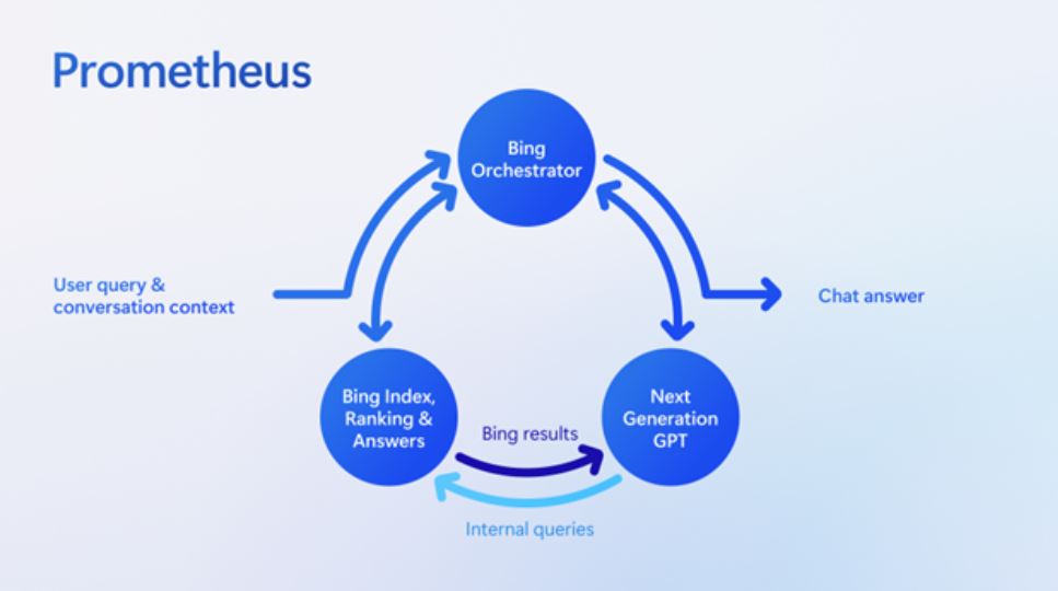Bing AI의 언어 능력과 검색의 연계에 대해서는, Microsoft가 2023년 2월 28일에 공개한 기사「새로운 Bing의 구축에 있어서」에서 해설되고 있습니다. 이 기사에 따르면 Bing AI는 검색 엔진으로써 Bing이 취득한 정보를 GPT-4에 전달한 후, 이 AI가 채팅 형식의 답변을 생성합니다. 이러한 검색과 답변 생성의 연계 기술은 Prometheus(인류에게 불을 준 그리스 신화의 신)이라고 불립니다.