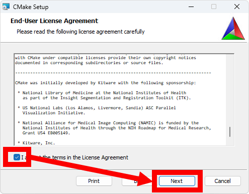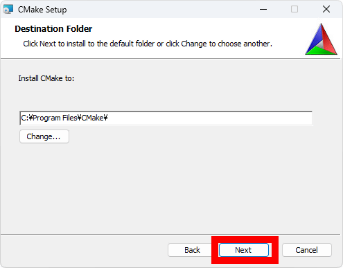 Add CMake to the system PATH for the current user를 선택하고 Next.
