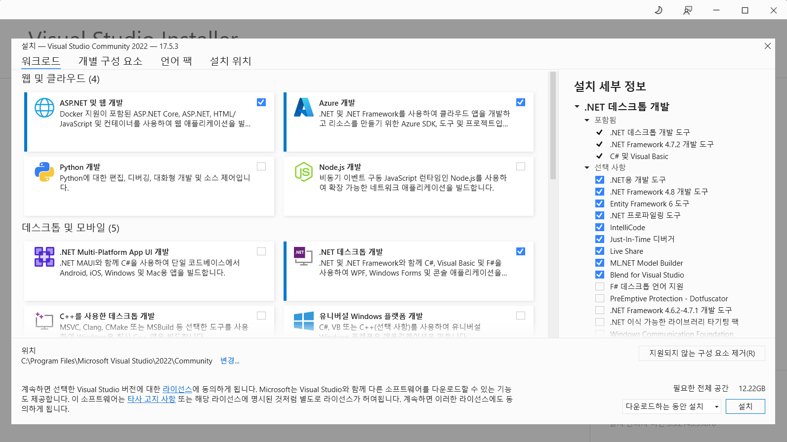 「ASP.NET 및 웹 개발」, 「Azure 개발」, 「.NET 데스크톱 개발」의 3개는 불필요하므로 체크를 제외합니다.