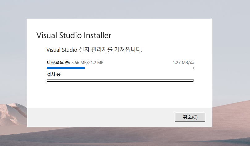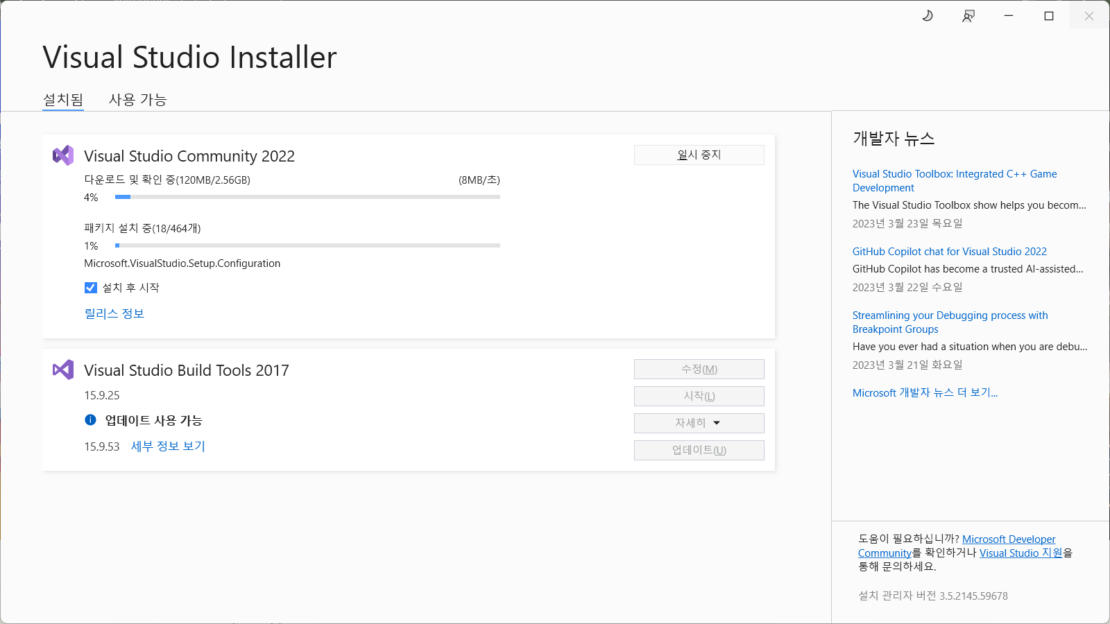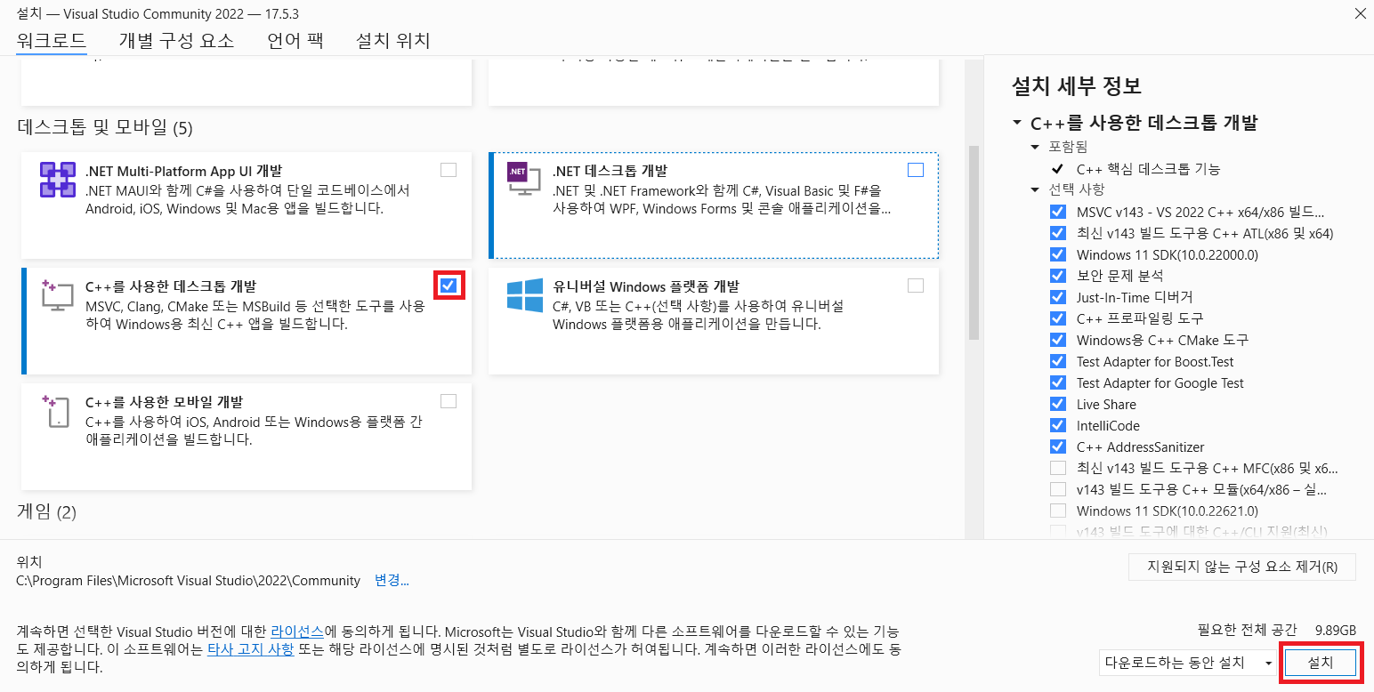 계속해서 「C++를 사용한 데스크톱 개발」에 체크하고 「설치」를 클릭.