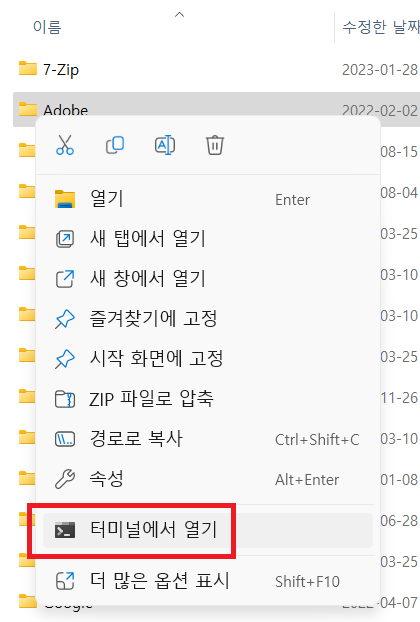 Git 설치가 완료되면 PC의 아무 폴더나 선택해서 마우스 우클릭에서 「터미널에서 열기」를 클릭합니다.