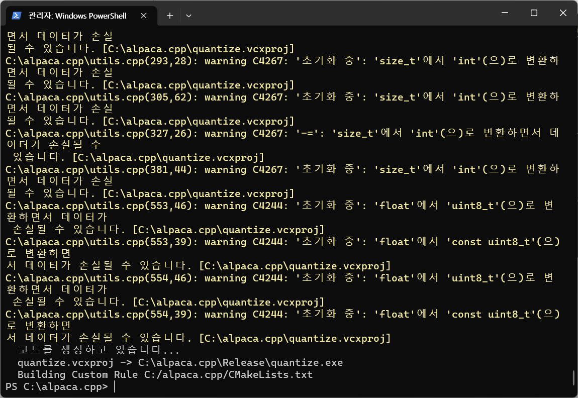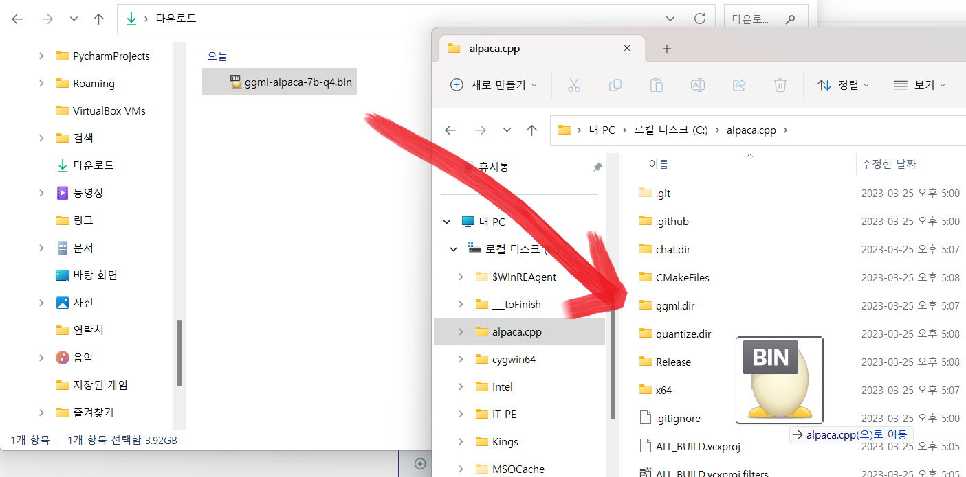 완성 된 bin 파일을 "alpaca.cpp"폴더로 이동합니다.