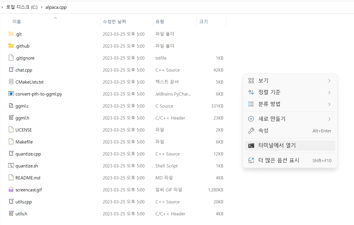 다음으로 "alpaca.cpp"폴더의 빈 부분을 마우스 우클릭 후 "터미널에서 열기"를 클릭합니다.