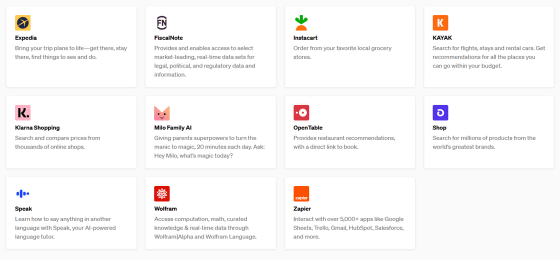 OpenAI는 ChatGPT용 플러그인 개발을 타사에도 개방하고 있습니다. 이미 'Expedia', 'FiscalNote', 'Instacart', 'Zapier'와 같은 서비스 플러그인이 개발되었으며, 사용자는 ChatGPT를 통해 '여행 계획을 세우기', '식품 주문', 'Gmail이나 Trello 등의 툴과 자동 연계' 등의 조작을 실행할 수 있습니다.