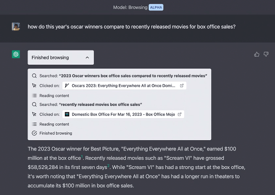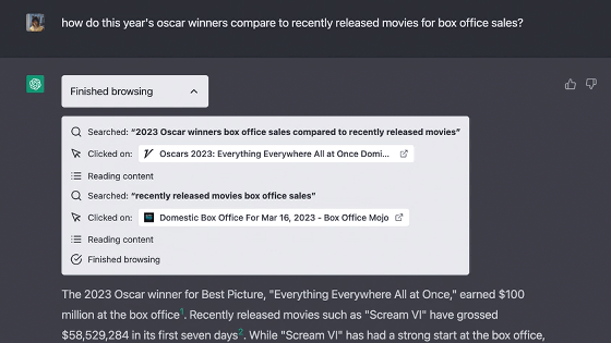 ChatGPT는 방대한 양의 텍스트를 학습하여 만들어진 채팅 AI입니다. 이 때문에,「ChatGPT가 아는 정보」는 학습 데이터가 작성된 시기까지의 정보에 한정되어, 최신 정보에 대응할 수 없는 경우가 많습니다. 이에 OpenAI는 ChatGPT에 "인터넷상의 최신 정보를 수집하는 기능"을 추가하는 플러그인 "Browsing"을 발표했습니다. Browsing을 실제로 사용하는 모습을 나타낸 이미지가 아래. ChatGPT에 "올해의 아카데미상 수상 작품의 흥행 수입은 최근 공개된 영화와 비교해 어떤가?"라고 질문하니, Chatgpt는 인터넷에서 관련 정보를 수집한 후 질문에 답변했습니다.