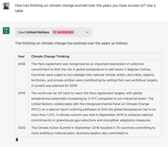 「Retrieval」은, 정보 제공을 허가한 개인·단체의 데이터에 액세스 할 수 있는 플러그인입니다. Retrieval을 사용하면 사용자는 자연스러운 대화의 흐름으로 정부기관이나 각종 단체의 문서를 열람할 수 있게 됩니다. 아래의 예에서는 "기후변화에 관한 사고방식의 변화를 표로 정리해"라는 지시를 받은 ChatGPT가 유엔의 데이터에 액세스 하여 지시대로 표를 작성하는 모습을 보여줍니다.