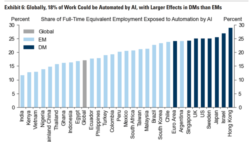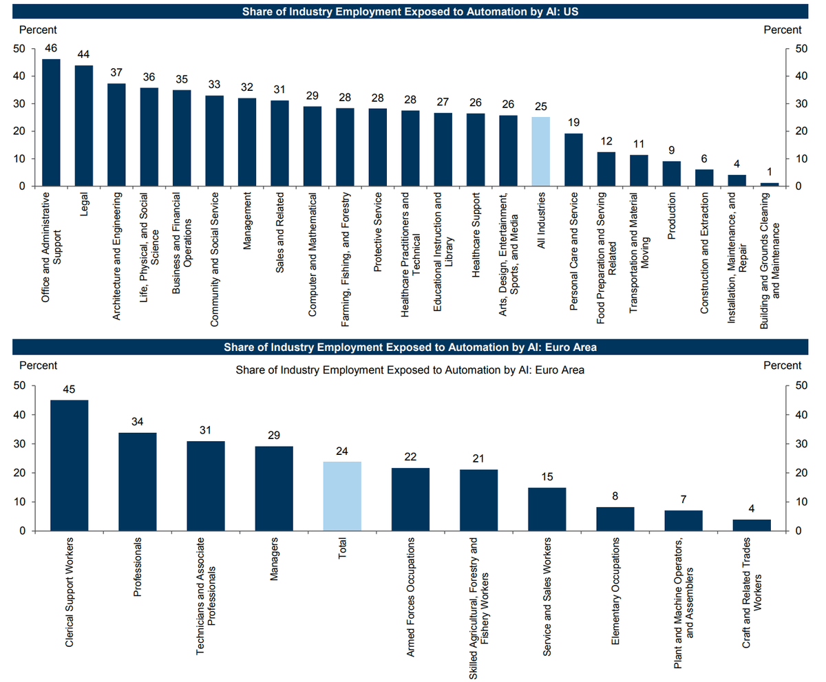 보고에 따르면 제너레이티브 인공지능은 10년간 세계 GDP를 7% 끌어올리는 혜택을 주는 반면 노동시장에 '큰 혼란'을 가져오며 주요 경제권에서 3억 명 규모의 풀타임 근로자가 노동 자동화의 영향을 받을 것으로 예측된다는 것. 논문의 저자인 조셉 브릭스 씨는 "인간이 만든 콘텐츠와 구분할 수 없는 콘텐츠를 생성하고 인간과 기계 간의 커뮤니케이션 장벽을 없애는 제네레이티브 AI의 능력은 잠재적으로 커다란 거시경제 효과를 가지고 있습니다."라고 말하면서 미국과 유럽의 직업 중 약 3분의 2가 AI에 의한 자동화에 노출되어 있다고 지적하고 있습니다.