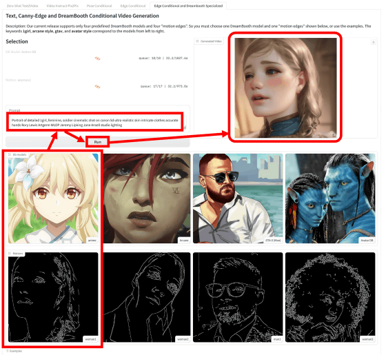 또한 추가 학습한 DreamBooth 모델과 윤곽 데이터를 사용하여 원하는 도안의 영상을 생성할 수도 있습니다.