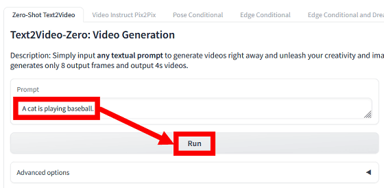 이번에는 「A cat is playing baseball.(야구를 플레이하는 고양이)」라고 입력하고 나서 「Run」을 클릭했습니다.