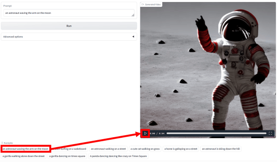 Text2Video-Zero의 데모 앱에는 사용 예로 'an astronaut waving the arm on the moon(월면에서 손을 흔드는 우주 비행사)', 'a sloth surfing on a wakeboard(웨이크보드에서 서핑하는 나무늘보)' 등의 생성 결과 세트가 여럿 준비되어 있으며, 각 프롬프트를 클릭하면 생성 결과를 볼 수 있습니다.