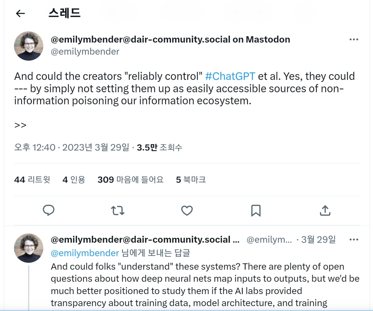 또한, 서한의 내용도 의심받고 있습니다. 워싱턴 대학교의 교수이자, 공개서한에 인용된 논문의 저자이기도 한 에밀리엠벤더 씨는 "공개서한에는 AI에 대한 과장이 흘러넘치고 있다"라고 트윗하며 공개서한이 자신의 연구를 오용하고 있다고 비난했습니다.