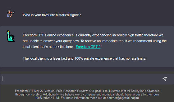 그래서, FreedomGPT를 실제로 사용해 보려고 했습니다만, 「동시 접속수가 너무 많아 대답할 수 없다」라는 메시지가 표시되었습니다.