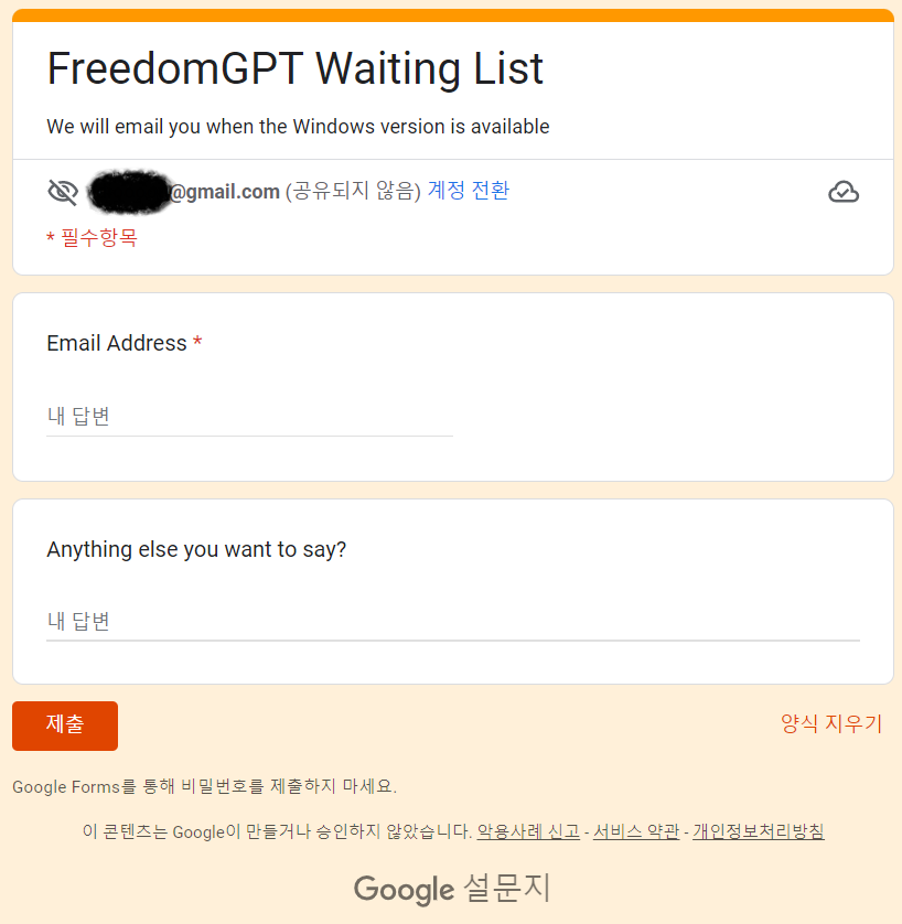 아래 양식이 표시되면 'Email Address' 란에 이메일 주소를 입력하고 '제출'을 클릭하시면 대기자 등록이 완료됩니다.