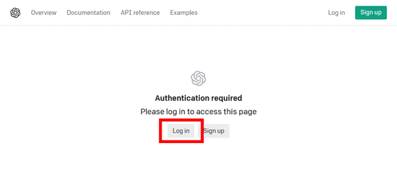 인증이 요구되는 화면이 되므로 「Log in」을 클릭. 덧붙여 Open AI의 계정을 가지고 있지 않은 사람은 「Sign up」을 클릭해 신규 가입이 필요합니다.