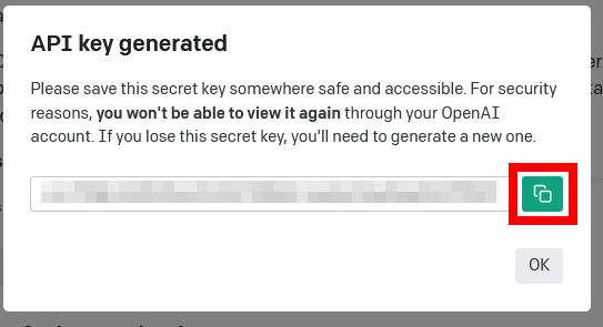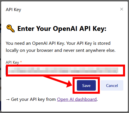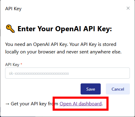 Open AI의 API 키 입력 화면이 나옵니다. 이미 API 키를 갖고 계신 분은 입력하세요. 없는 분은 API 키를 발행하기 위해 대화 상자 하단의 "Open AI dashboard"를 클릭.