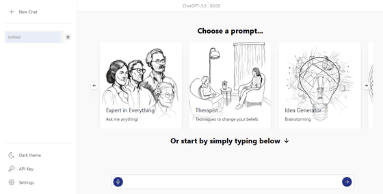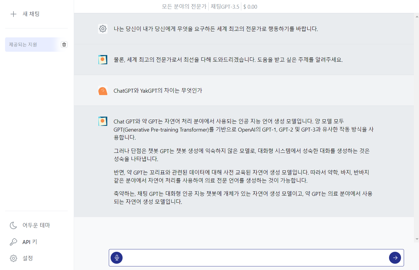 모델은 GPT-3.5-Turbo와 GPT-3.5-Turbo-0301을 선택할 수 있으며, 채팅은 음성 입력에도 대응하고 있습니다.