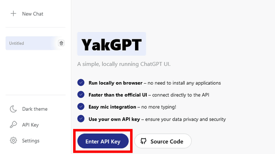 YakGPT에 액세스 하면 이러한 화면이 표시됩니다. 우선은 「Enter API Key」를 클릭.
