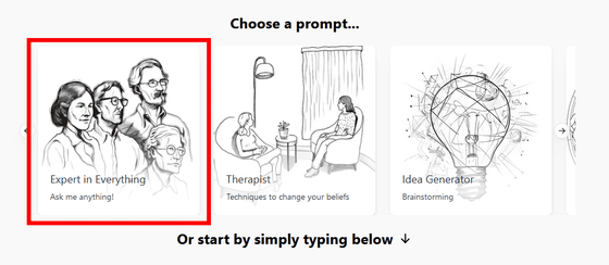 예시된 프롬프트를 선택하거나 하단 폼에 직접 입력할지 선택할 수 있으므로 "Expert in Everything" 프롬프트를 선택해 보았습니다.