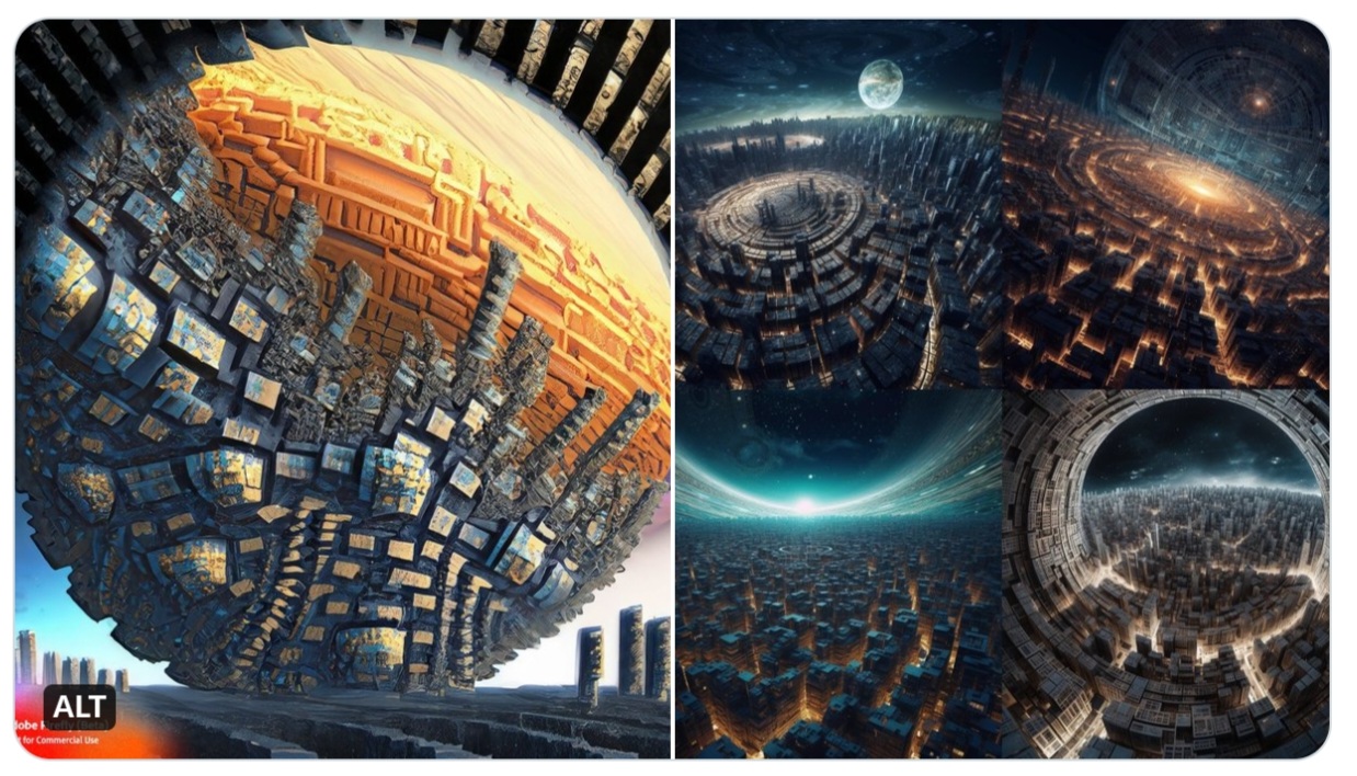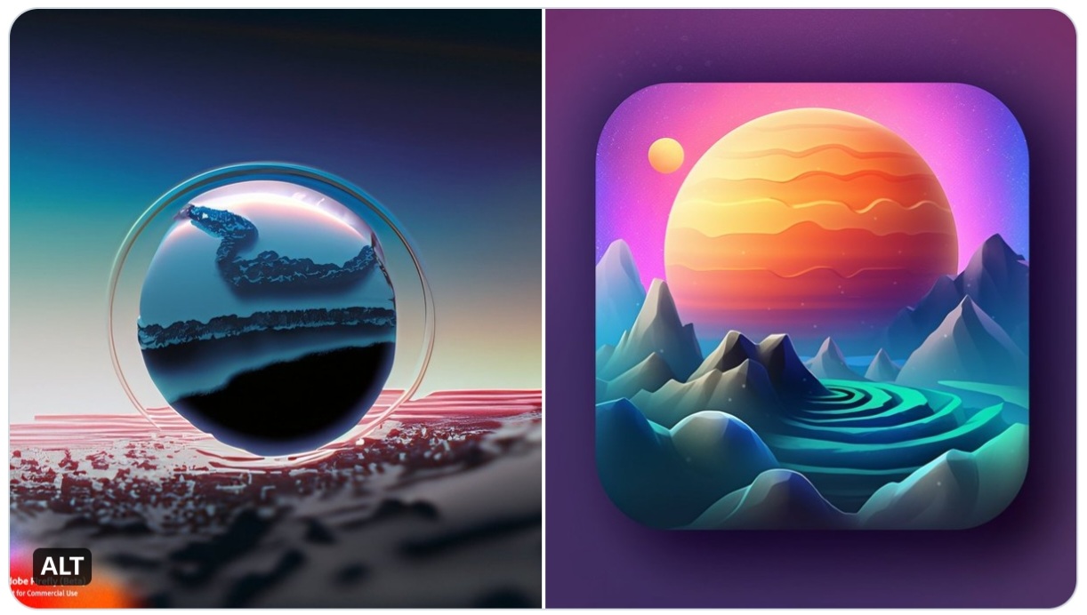「iOS 앱의 아이콘, 스큐어모피즘(대상을 원래 그대로의 모습으로 사실적으로 표현하는 디자인 기법으로 3차원적이고 사실주의적) 스타일의 SF 행성의 풍경」프롬프트로 출력된 것이 이것. "Adobe Firefly는 앱 아이콘이라는 지시를 이해할 수 있을까?"라는 것을 확인하기 위해 입력되었지만, 이것은 불가능한 모양입니다.