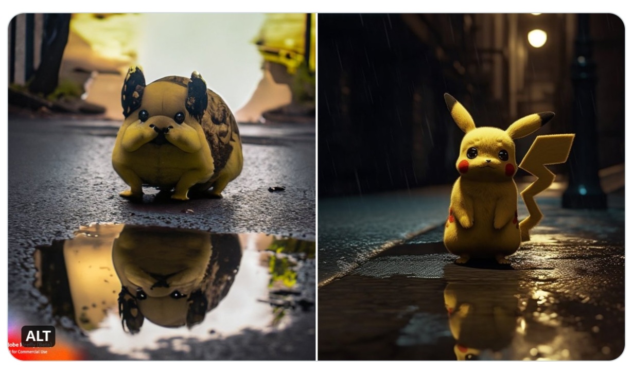 위와 같은 프롬프트에서 이번에는 피카츄를 출력해 본 것이 이런 느낌. 또한 Midjourney는 정확하게 묘사되었지만 Adobe Firefly는 약간 다른 해석을 했습니다. 저작권으로 보호된 콘텐츠 묘사는 상용으로 이용할 수 없기 때문에, Adobe Firefly를 사용하는 것이 좋습니다.