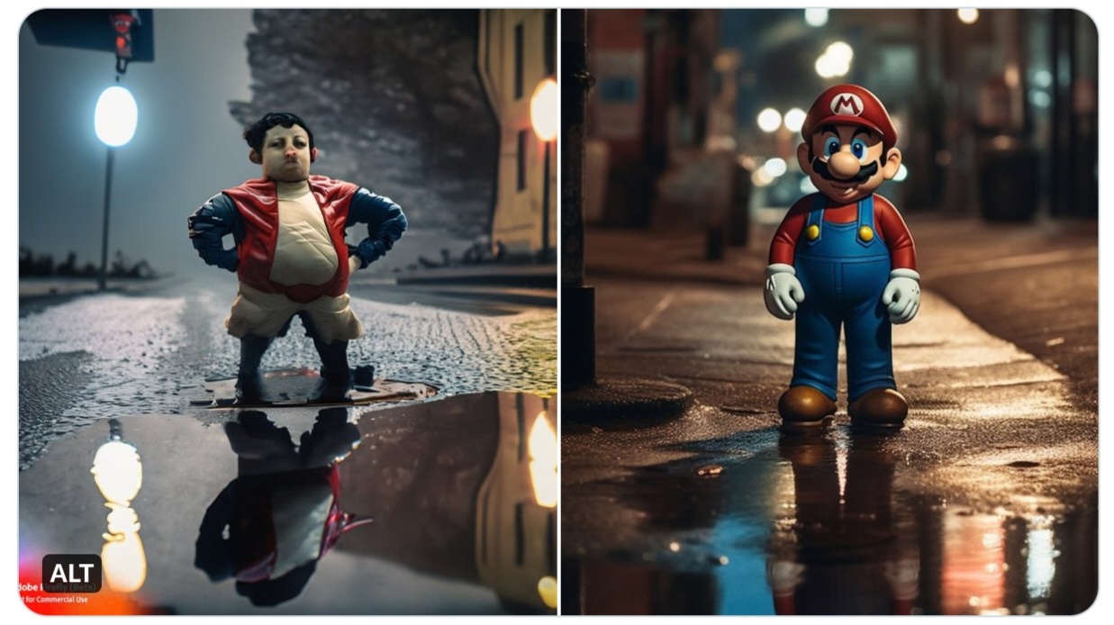 다음은 "희미한 거리에서 웅덩이에 크게 비치는 슈퍼 마리오"라는 프롬프트. Midjourney는 요청한 캐릭터를 올바르게 출력하고 있지만, Adobe Firefly는 마리오와 비슷한 난쟁이를 비추고 있습니다.
