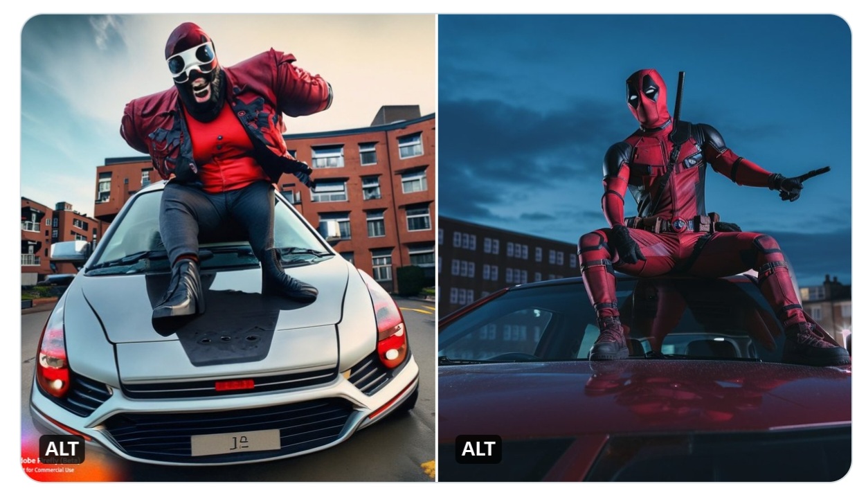 아래가 「차 위에서 포즈를 취하는 데드 풀」이라는 프롬프트로 출력된 화상입니다. 저작권으로 보호된 캐릭터인 데드풀은, Adobe Firefly(왼쪽)에서는 외형이 비슷한 무언가로서 출력되고 있습니다. Midjourney(오른쪽)에서는 데드 풀이 올바르게 출력되고 있습니다.