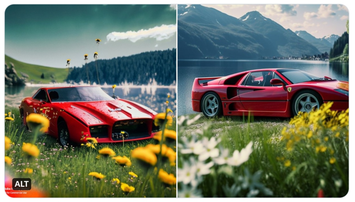 마지막으로 「지알제프 호수에서 민들레에 둘러싸인 붉은 Ferrari F40」이라는 프롬프트를 시험한 결과가 이런 느낌. 지알제프 호수는 산으로 둘러싸인 스위스 호수로, Midjourney는 이미지 내에서 그 산을 재현하고 있는 모습. Adobe Firefly는 다소 평야에 가깝고, 사실적인 Midjourney에 비해 약간 일러스트스러운 이미지가 되어 있습니다.