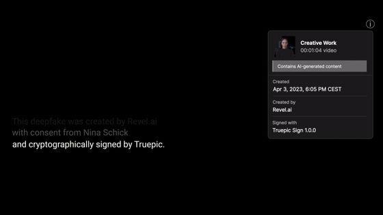 Revel.ai가 완성시킨 딥 페이크 영상에는, Truepic에 의해 AI로 합성된 것이라고 하는 정보와 제작자의 정보 등을 기재한 인증 라벨이 부여되었습니다.