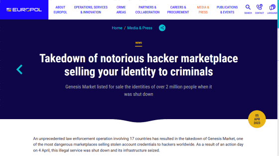 연방수사국(FBI) 및 유럽형사경찰기구(유로폴) 등 수사기관의 국제적인 협력작전 'Operation Cookie Monster(쿠키몬스터 작전)'에 의해 개인정보를 매매하는 범죄 플랫폼 'Genesis Market'이 폐쇄되었습니다. 또한, 이 작전의 결과로, 119명을 체포했다는 것도 밝혀지고 있습니다.