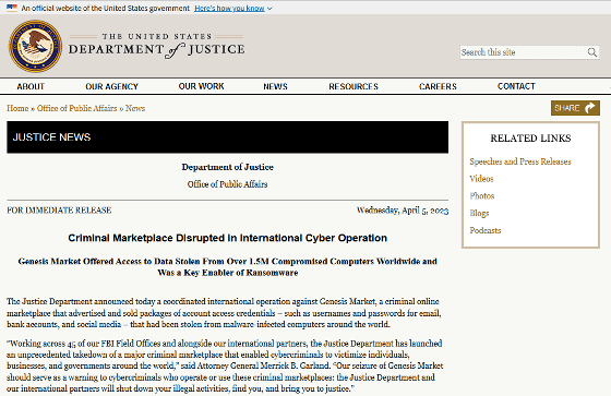 'Genesis Market'에 대한 수사는 FBI와 네덜란드 경찰이 중심이 되어 진행되었고, 호주, 캐나다, 덴마크, 에스토니아, 핀란드, 프랑스, 독일, 이탈리아, 네덜란드, 뉴질랜드, 폴란드, 루마니아, 스페인, 스웨덴・스위스・영국・미국(알파벳순)의 수사 당국이 협력하는 국제적인 작전 「쿠키 몬스터 작전」으로 발전. 그리고 2023년 4월에는 'Genesis Market'을 폐쇄시키는 데 성공했습니다. 기사 작성 시점에서는, 「Genesis Market」에 액세스 하면 「THIS WEBSITE HAS BEEN SEIZED(이 웹사이트는 압수되었습니다)」라고 적힌 아래의 이미지가 표시됩니다.