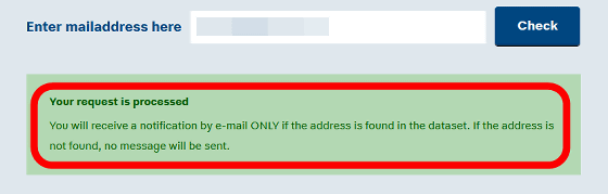 페이지 최하부까지 스크롤하면 「Enter mailaddress here」라고 기재된 부분에 피해 상황을 확인하고 싶은 계정에 사용된 메일 주소를 입력하고 「Check」를 클릭.