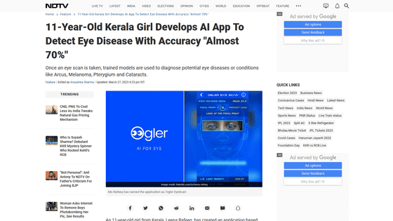 백내장과 익상편을 비롯한 눈 질환의 진단에는 기본적으로 전문적인 의사의 검사가 필요합니다. 그러나 인도 케랄라의 11세 소녀, 리나 라피크 씨가 AI를 이용한 독자적인 스캔 방법으로 눈의 질병이나 기타 상태를 검출하는 iPhone용 앱 'Ogler EyeScan'을 개발했습니다.