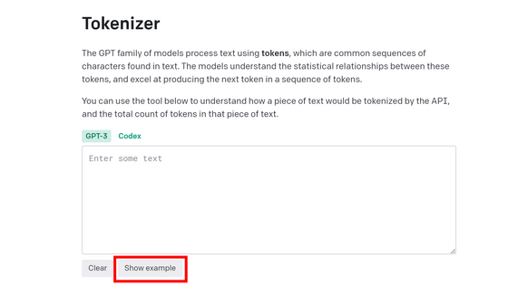 Tokenizer의 화면은 이런 느낌. 텍스트를 입력해야 하지만 일단 Show example을 클릭하여 예제를 살펴보겠습니다.