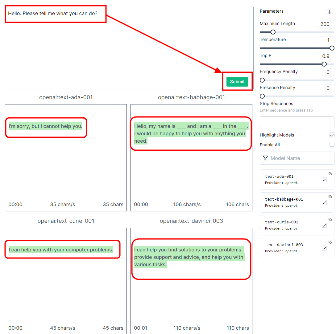 위의 입력란에 텍스트를 넣고 「Submit」를 클릭하면, 전체 AI가 동시에 답해 준다는 것. AI별로 어떤 답변이 반환되는지 비교할 수 있습니다.
