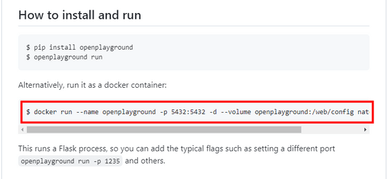 $ docker run --name openplayground -p 5432:5432 -d --volume openplayground:/web/config natorg/openplayground
