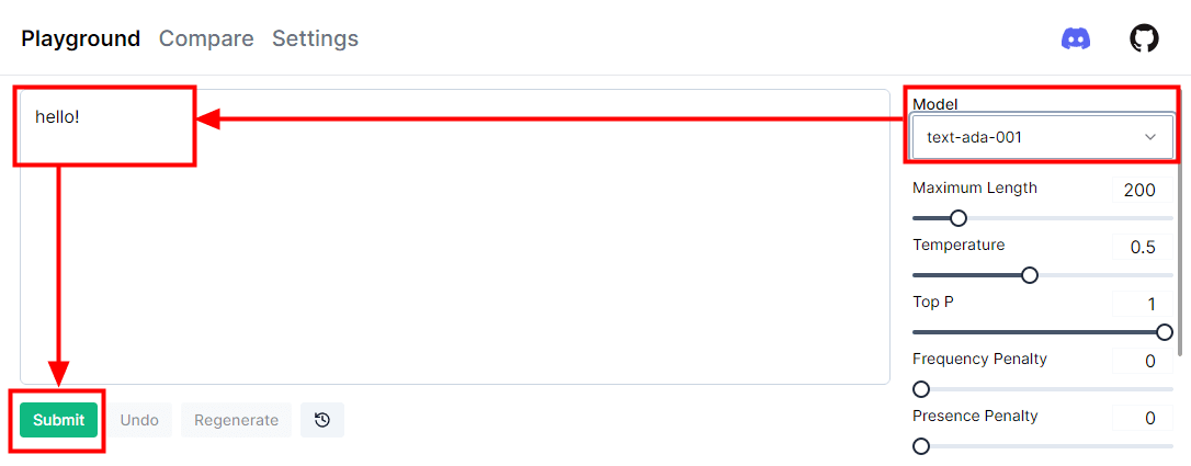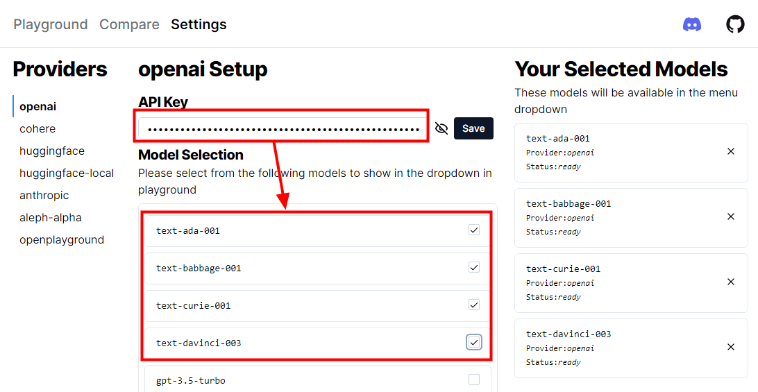 이번에는 OpenAI에 연결해 보겠습니다. OpenAI의 API 키를 입력하고 비교 후보 모델을 확인합니다. 이번에는 위에서 4개의 "text-ada-001", "text-babbage-001", "text-curie-001", "text-davinci-003"을 선택해 보았습니다.