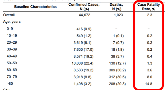조사 결과를 바탕으로 한 연령별 증상과 수치, 치사율도 자세하게 발표하고 있습니다. 다음은 그 목록입니다. 각 연령대 별 Confirmed Cases(감염 확인자 수), Deaths(사망자 수), Case Fatality Rate(치사율)이 기록되어 있으며, 괄호 안의 숫자는 모두 '전체의 몇 퍼센트?'의 수치입니다. 치사율을 보면 10세 미만 사망자는 없습니다. 10대 ~ 30대 치사율은 0.2%, 40대 0.4%, 50대 1.3%, 60대는 3.6%, 70대 8%, 80세 이상은 14.8%. 전체적인 치사율은 2.3%입니다. 이 결과에서 연령이 높아짐에 따라 COVID-19의 치사율은 급격히 상승하는 것을 알 수 있습니다.