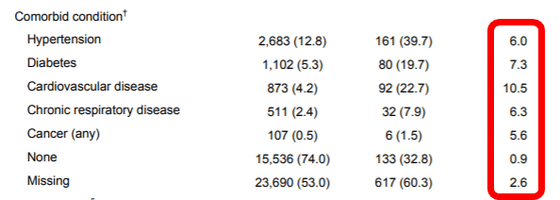 Comorbid condition(지병)을 보면 Hypertension(고혈압) 환자의 치사율은 6%이고, Diabetes(당뇨병) 환자는 7.3%, Cardiovascular disease(심장 혈관 질환) 환자는 10.5%, Chronic respiratory disease(만성 호흡기 질환) 환자는 6.3%, Cancer(암) 환자는 5.6%, None(지병 없음)이면 0.9%, Missing(알 수 없음)이면 2.6%이라는 결과입니다. 이미 지병이 있는 사람이 COVID-19에 걸리면 위험하다는 것을 알 수 있습니다.