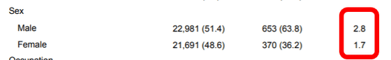 Sex(성별)을 보면, 남성의 치사율은 2.8%, 여성의 치사율은 1.7%로 남성의 사망률이 높다는 결과.