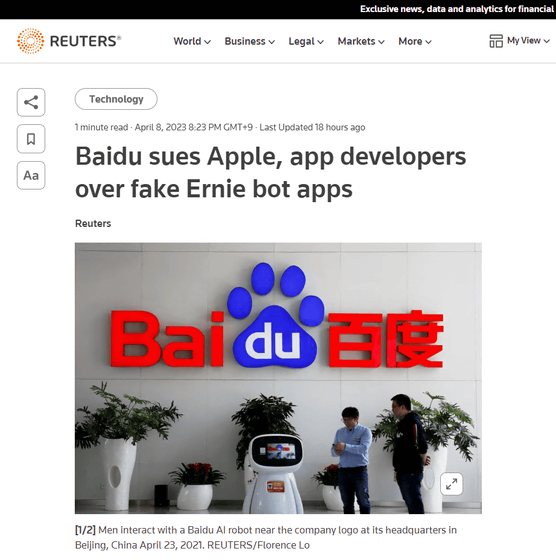 https://www.reuters.com/technology/baidu-sues-apple-app-developers-over-fake-ernie-bot-apps-2023-04-08/