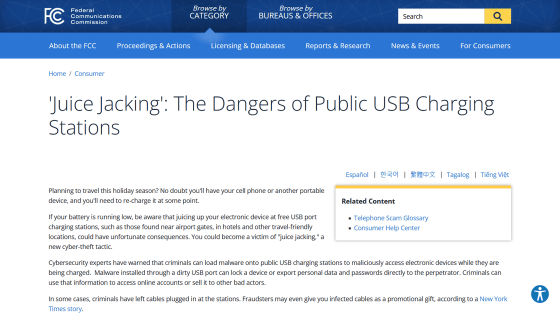 충전용 스테이션을 악용한 공격의 위험성에 대해서는 이전부터 FBI나 연방통신위원회(FCC)의 웹사이트에서도 지적되고 있습니다.