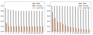 왼쪽 도표는 얼굴 특징이 여성인 비율을 주황색으로 표시합니다(회색은 남성). 오른쪽은 피부색이 흰색이 아닌 비율이 파란색으로 표시하고 있습니다.