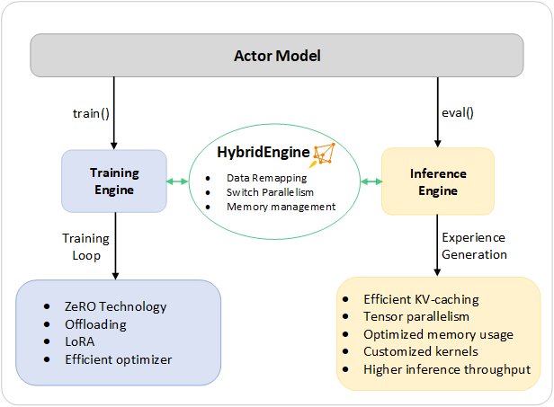 또한 "DeepSpeed-RLHF 파이프라인"에 의한 학습을 폭넓은 하드웨어로 빠르고 저비용으로 실행하기 위해, 지금까지 DeepSpeed가 발표한 ZeRO 등의 추론과 학습을 위한 모든 시스템을 융합한 "DeepSpeed 하이브리드 엔진"이 구성되어 있습니다.