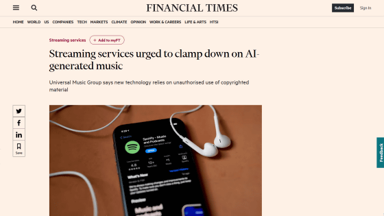 경제지인 파이낸셜 타임스는, 유니버설 뮤직 그룹이 Spotify 및 Apple Music과 같은 음악 스트리밍 서비스에, AI 학습에 악곡이 사용되는 것을 방지하도록 요청하는 이메일을 보냈다고 보도했습니다.
