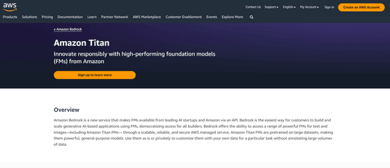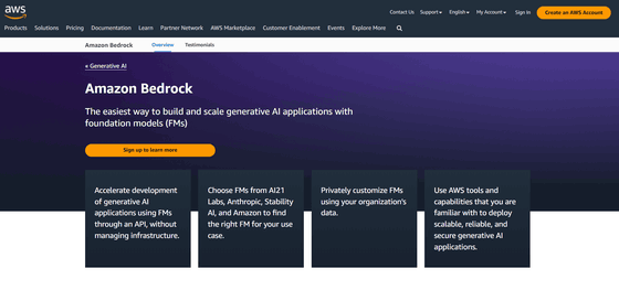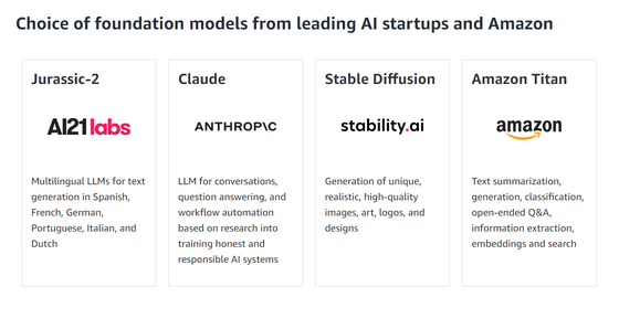 AWS에 따르면 Bedrock은 이미지 생성 AI 「Stable Diffusion」을 개발하는 Stability AI 나 대화형 AI 「Claude」를 개발하는 Anthropic, 문장 생성 AI 「Wordtune Spices」를 개발하는 AI21 Labs, 그리고 Amazon이 가진 기초 모델에 API를 통하여 액세스 할 수 있는 서비스라는 것.