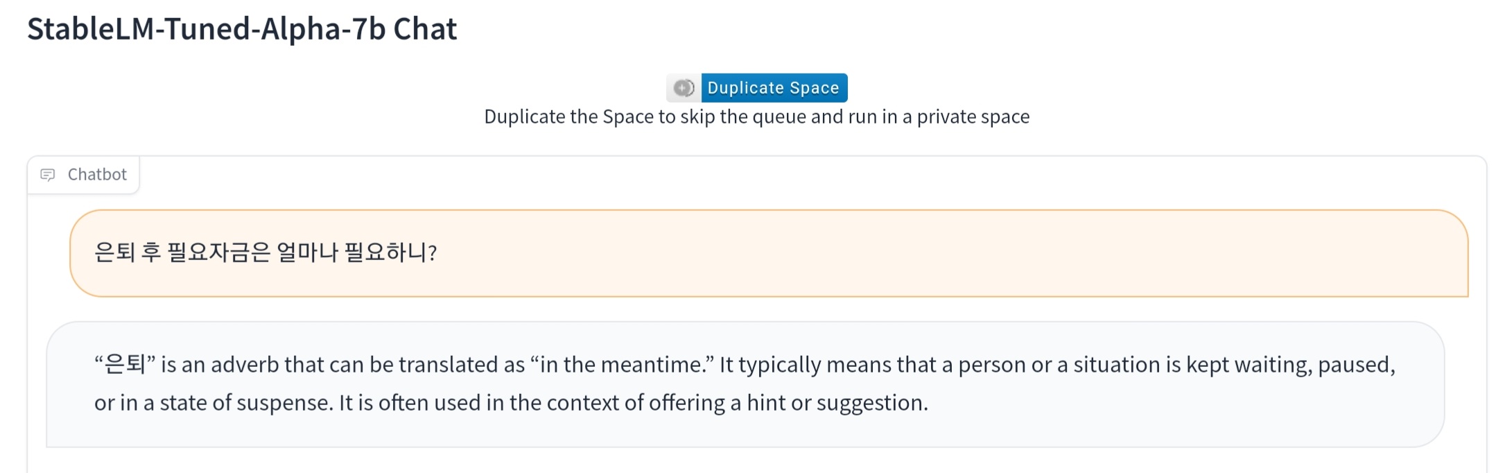 ▲ 70억 파라미터로 파인 튜닝된 모델로 대화하는 예. HuggingFace 에서 평가판 사용 가능.