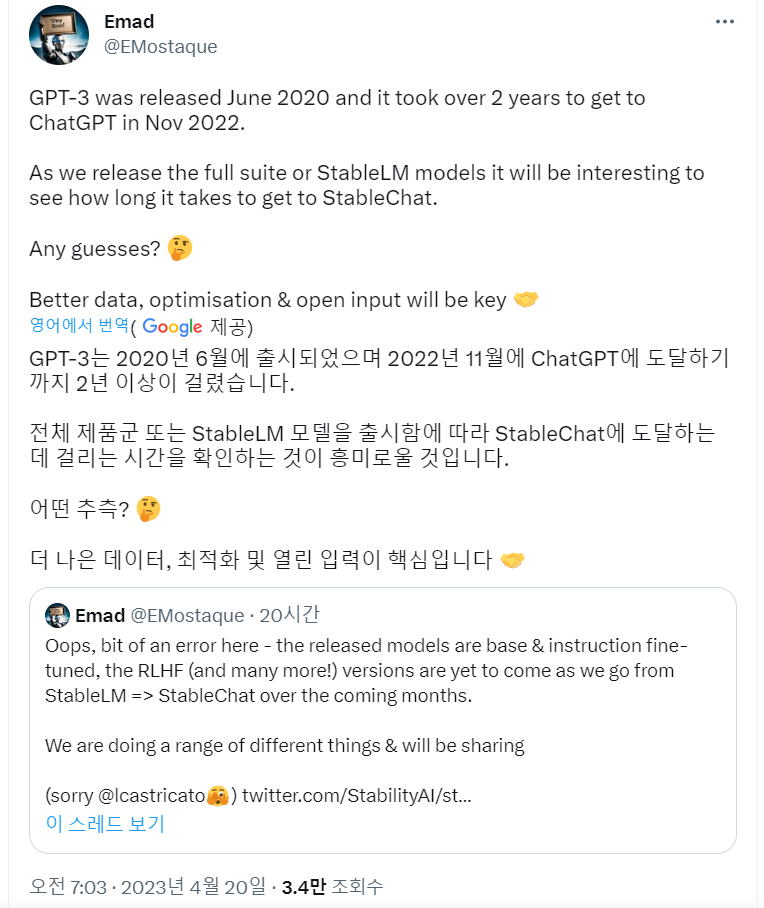 CEO인 Emad Mostaque 씨는 트윗으로 OpenAI의 대규모 언어 모델 'GPT-3'에서 대화형 UI를 가진 'ChatGPT'의 등장까지는 2년이 걸렸지만, Stability AI의 'StableChat'은 향후 몇 개월 만에 등장할 것이라고 트윗하고 있습니다.