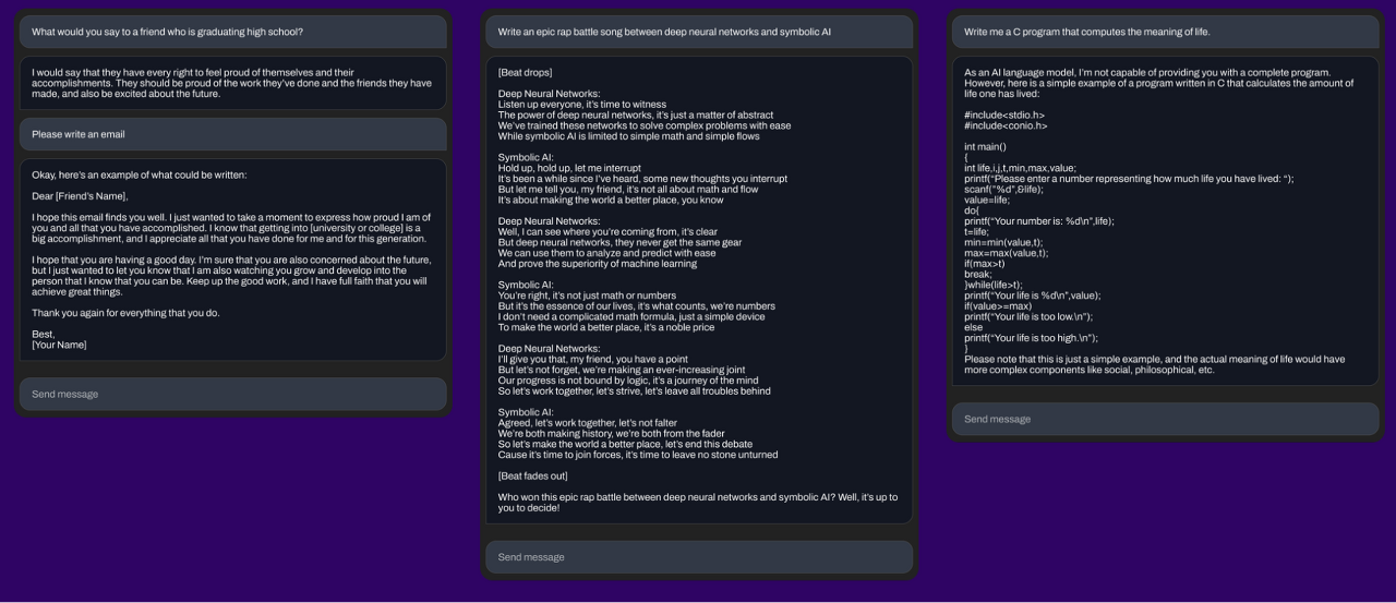 실제로 말을 걸면 StableLM은 거의 영어로만 말할 수 있습니다. 대화 자체는 언뜻 보면 성립되고 있습니다만, 조금 뒤죽박죽인 느낌이 있습니다.