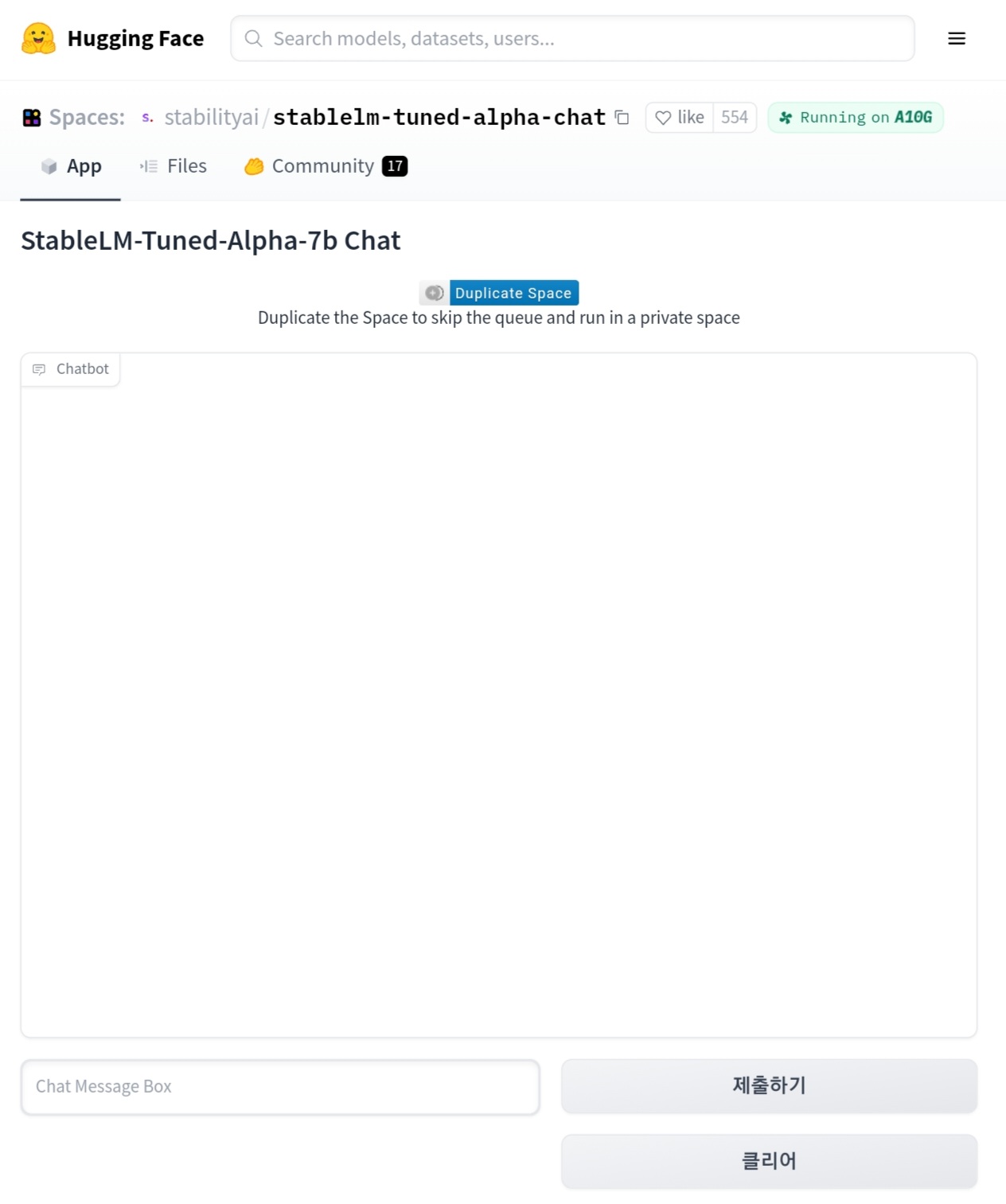 StableLM은 AI용 리포지토리 서비스의 Hugging Face에 데모 버전이 공개되어 있으며, 다음에서 액세스 할 수 있습니다.